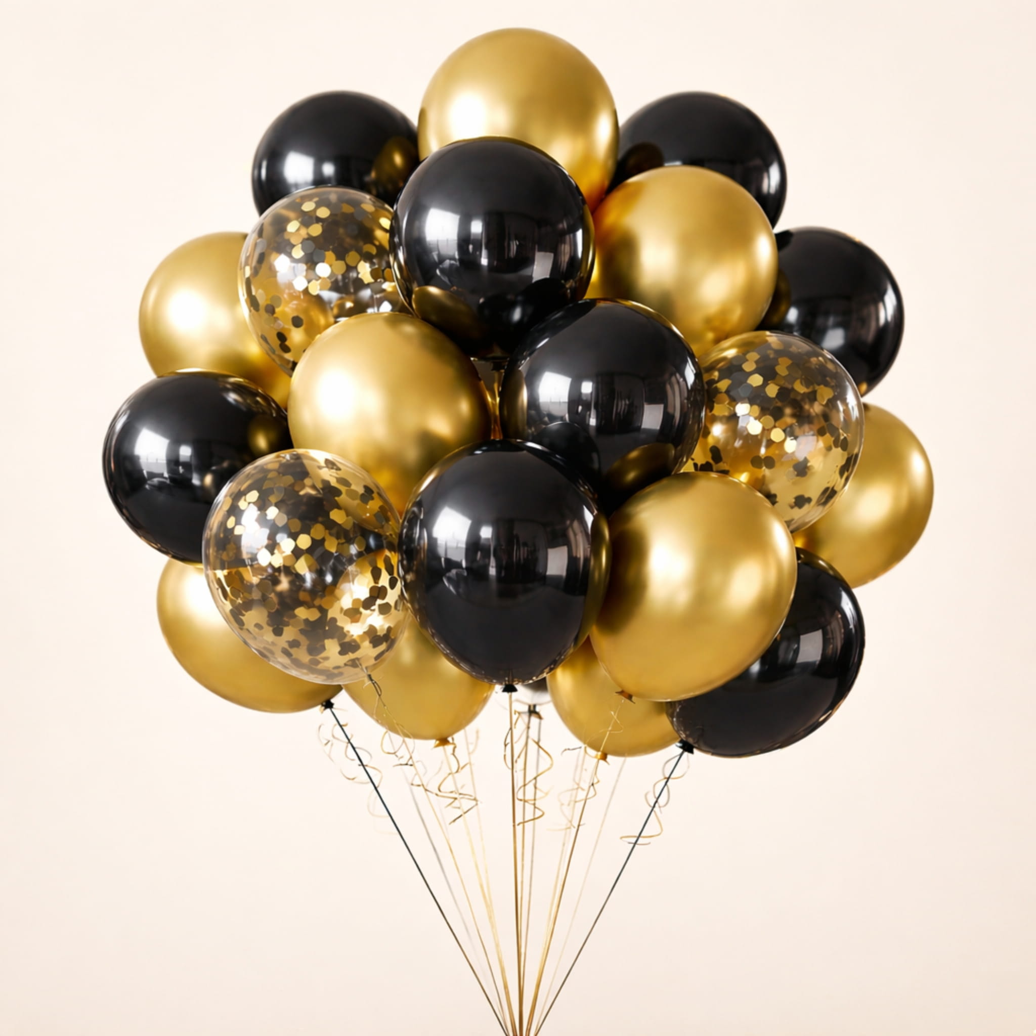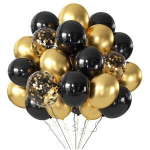 Zestaw 50 balonów lateksowych 12 cali (30,5 cm): 20 złotych chromowanych, 20 czarnych matowych i 10 transparentnych z konfetti w kolorze złotym. Do napełniania powietrzem i helem.