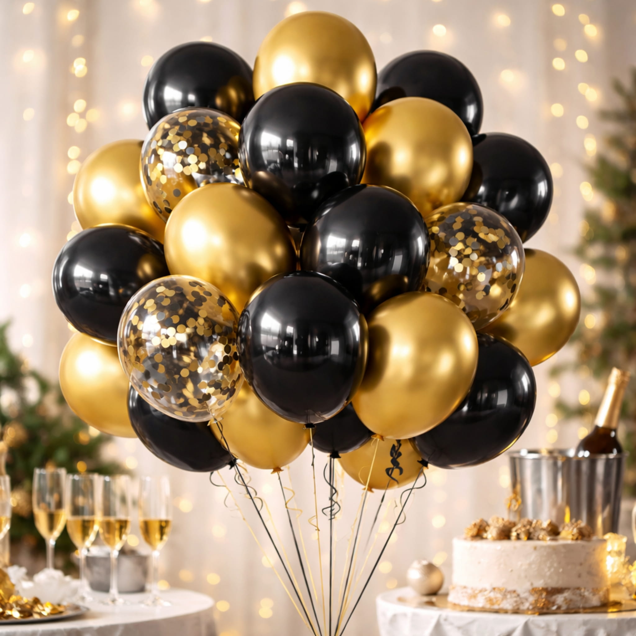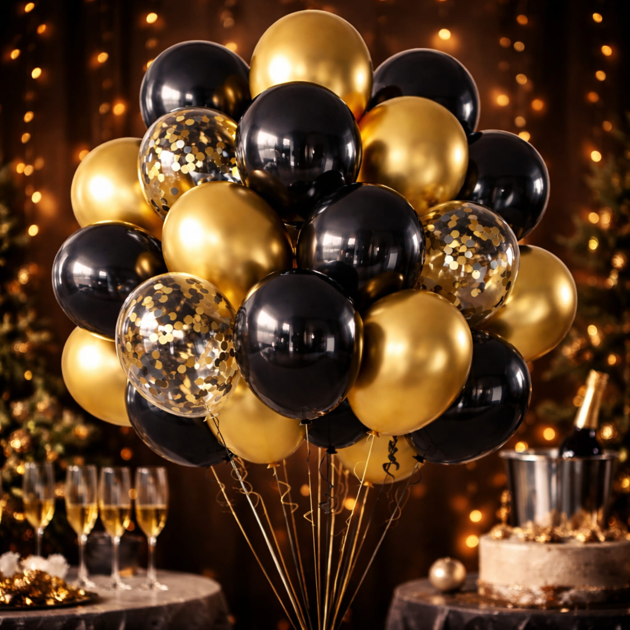 Zacznij od ułożenia balonów w proporcjach z zestawu: czarne jako tło, złote chromowane jako mocny akcent, a transparentne z konfetti jako „rozświetlenie” kompozycji. Taki układ dobrze wygląda w girlandzie nad stołem, przy wejściu lub jako tło do zdjęć. Jeśli chcesz uzyskać bardziej elegancki efekt, trzymaj się ograniczonej palety barw i nie dodawaj wielu dodatkowych kolorów. Dobierz do kompletu inne warianty i rozmiary w tej samej stylistyce w kategorii balony lateksowe. Dzięki temu łatwo utrzymasz spójny, czarno-złoty motyw.