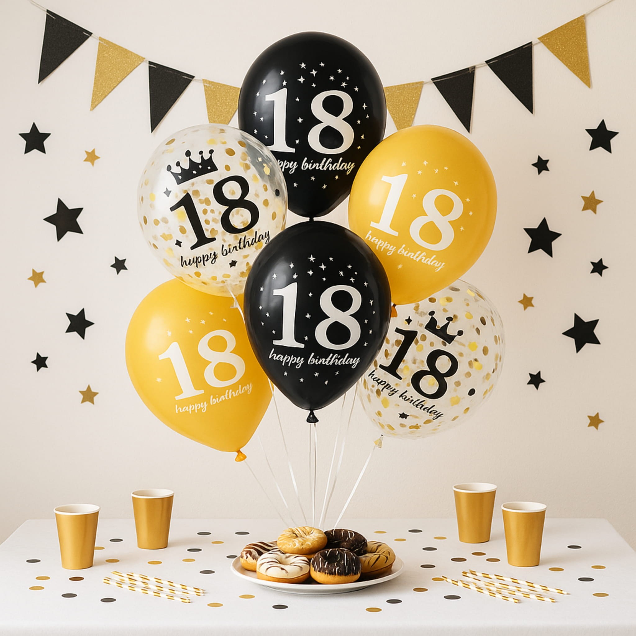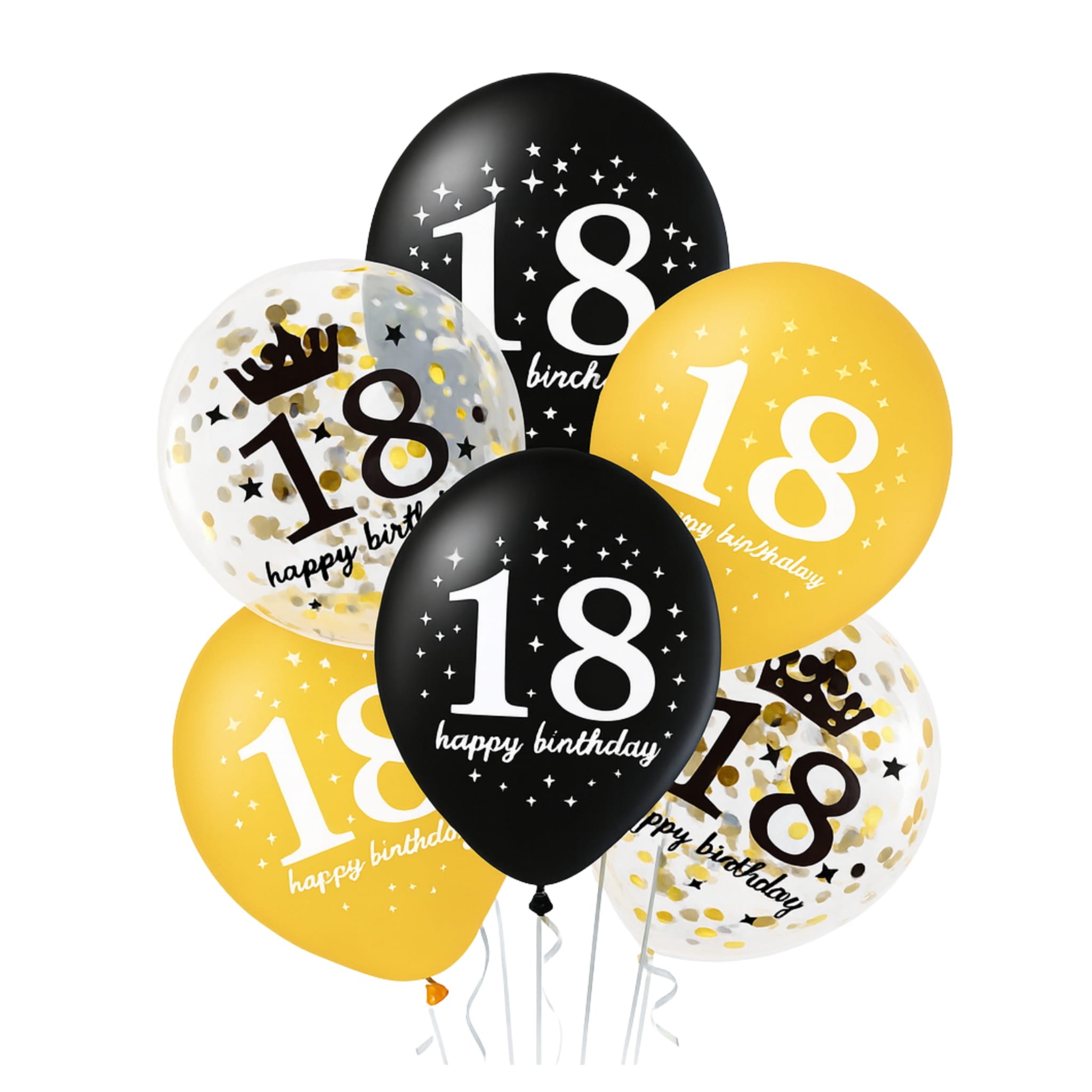 Zestaw 6 balonów lateksowych z nadrukiem „Happy Birthday 18” w kolorach czarnym, złotym i transparentnym z konfetti. Balony mają ok. 30 cm po napompowaniu, nadają się na powietrze lub hel i zawierają złotą wstążkę ok. 2 m.