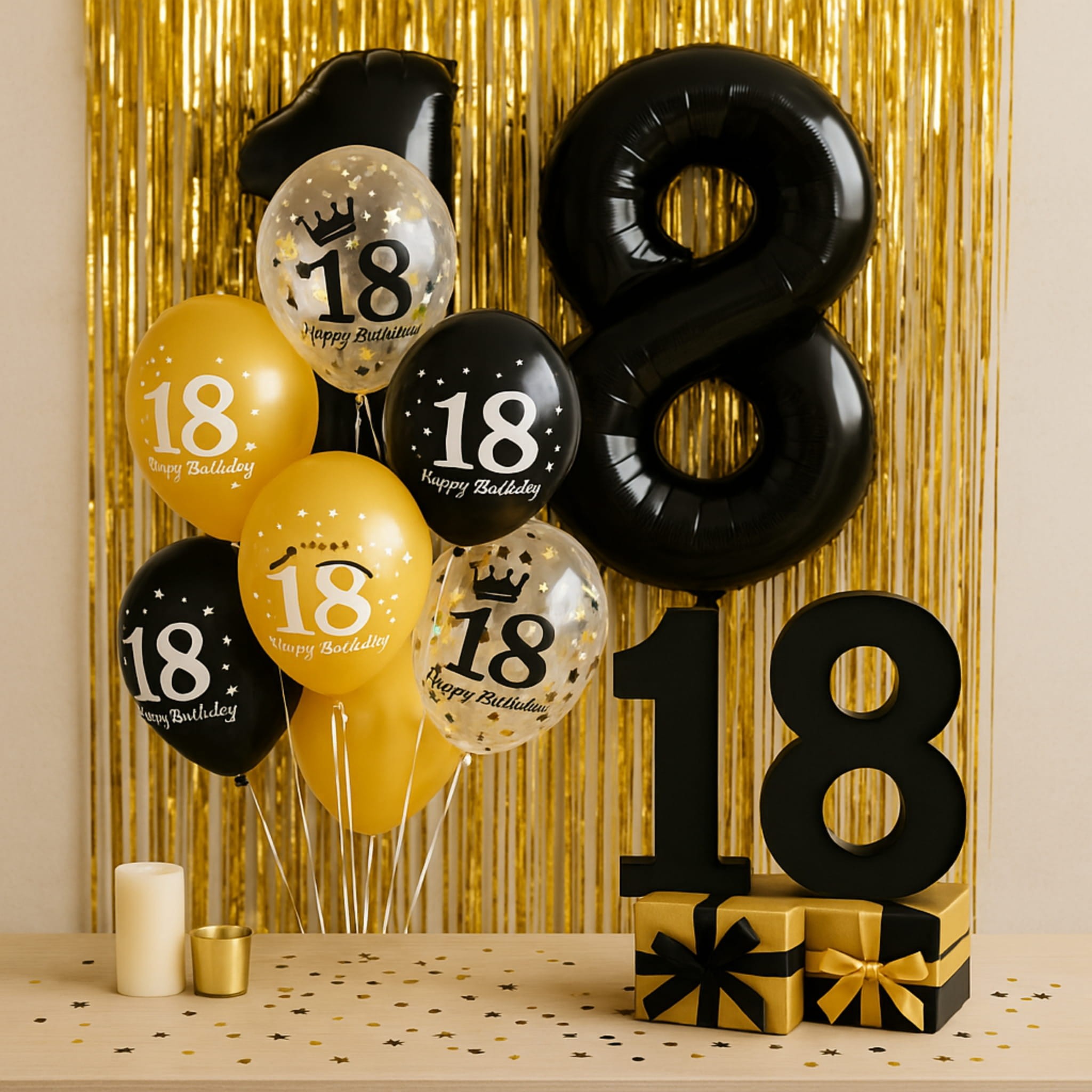 Zestaw balonów lateksowych z nadrukiem „Happy Birthday 18” to szybki sposób na przygotowanie dekoracji na osiemnastkę. W komplecie otrzymujesz 6 balonów w trzech wariantach: czarne matowe, złote matowe oraz transparentne ze złotym konfetti. Po napompowaniu balony osiągają ok. 30 cm i nadają się zarówno do wypełnienia powietrzem, jak i helem. Dodatkowo w zestawie znajduje się złota wstążka dekoracyjna o długości ok. 2 metrów, która ułatwia mocowanie i łączenie balonów. Czarno-złota kolorystyka dobrze pasuje do aranżacji w stylu glamour.