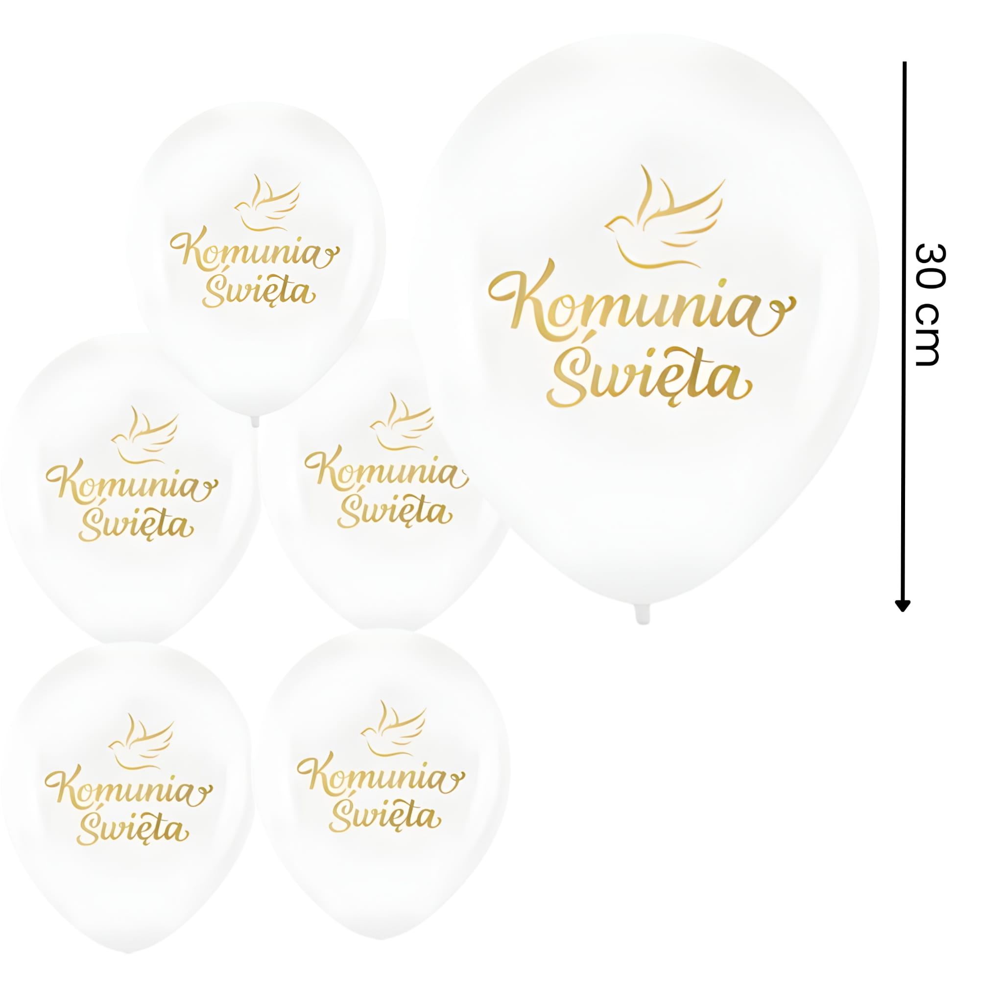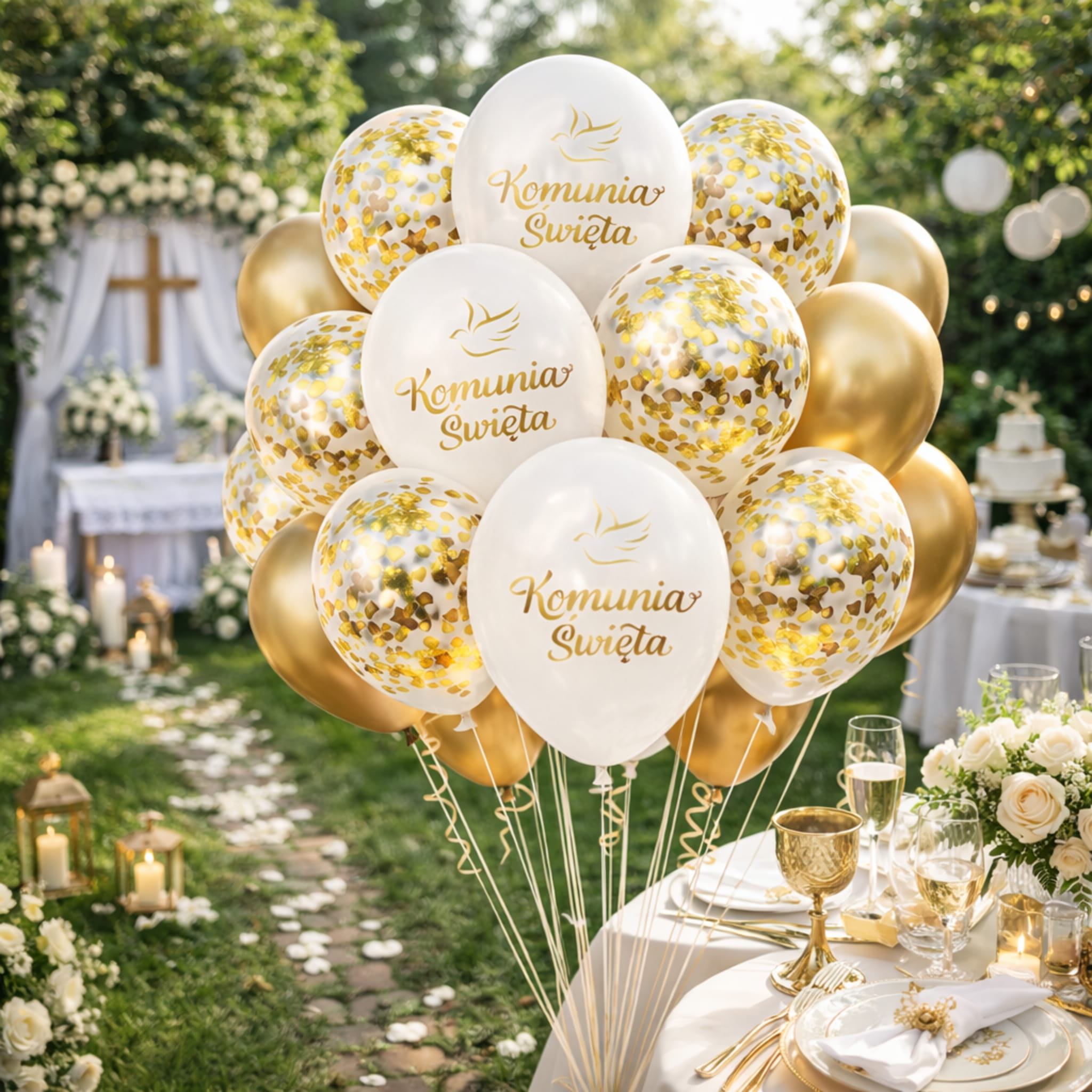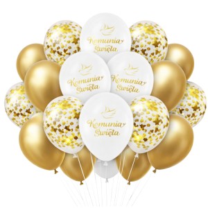 Odpowiedź: 12x balon z konfetti (złote), 6x balon złoty, 5x balon perłowy biały z nadrukiem „Komunia Święta” oraz złota wstążka do łączenia.