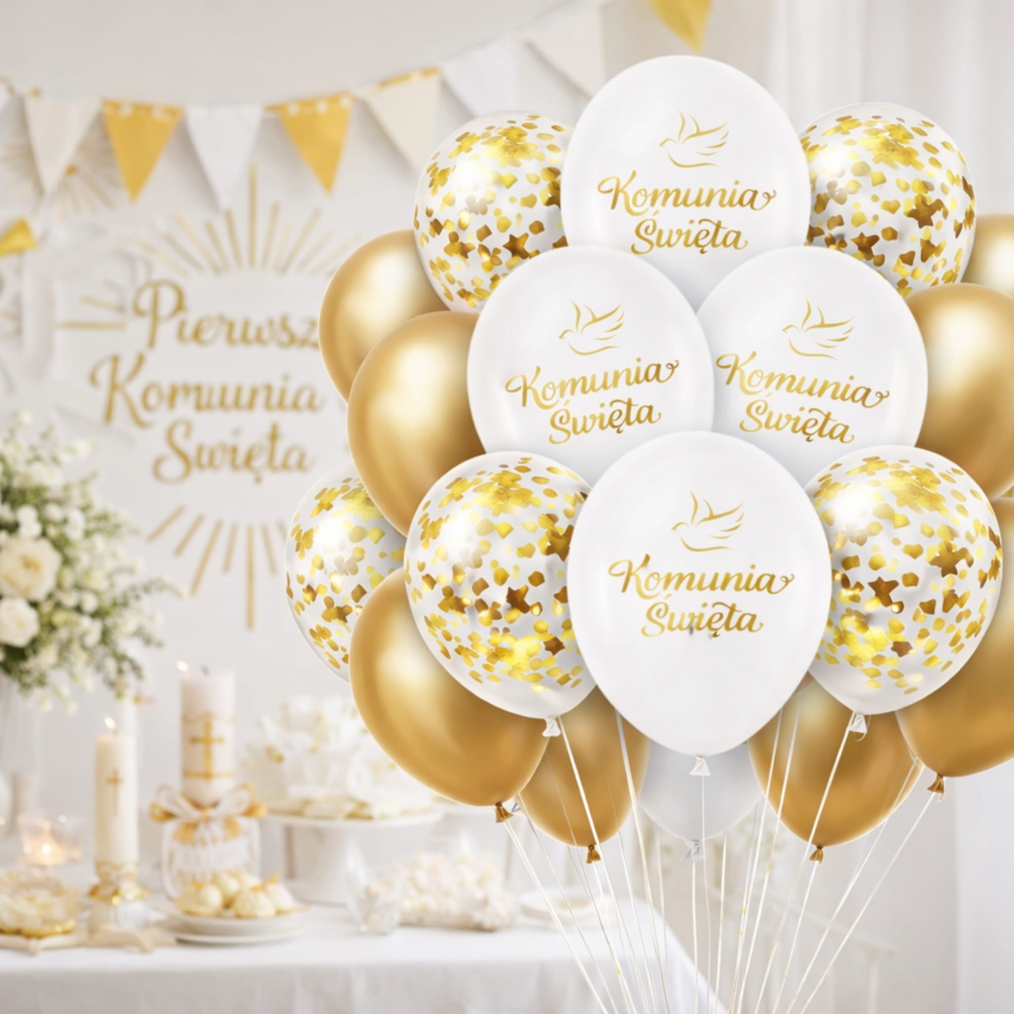 - Spójna kolorystyka biało-złota pasuje do klasycznych dekoracji komunijnych.