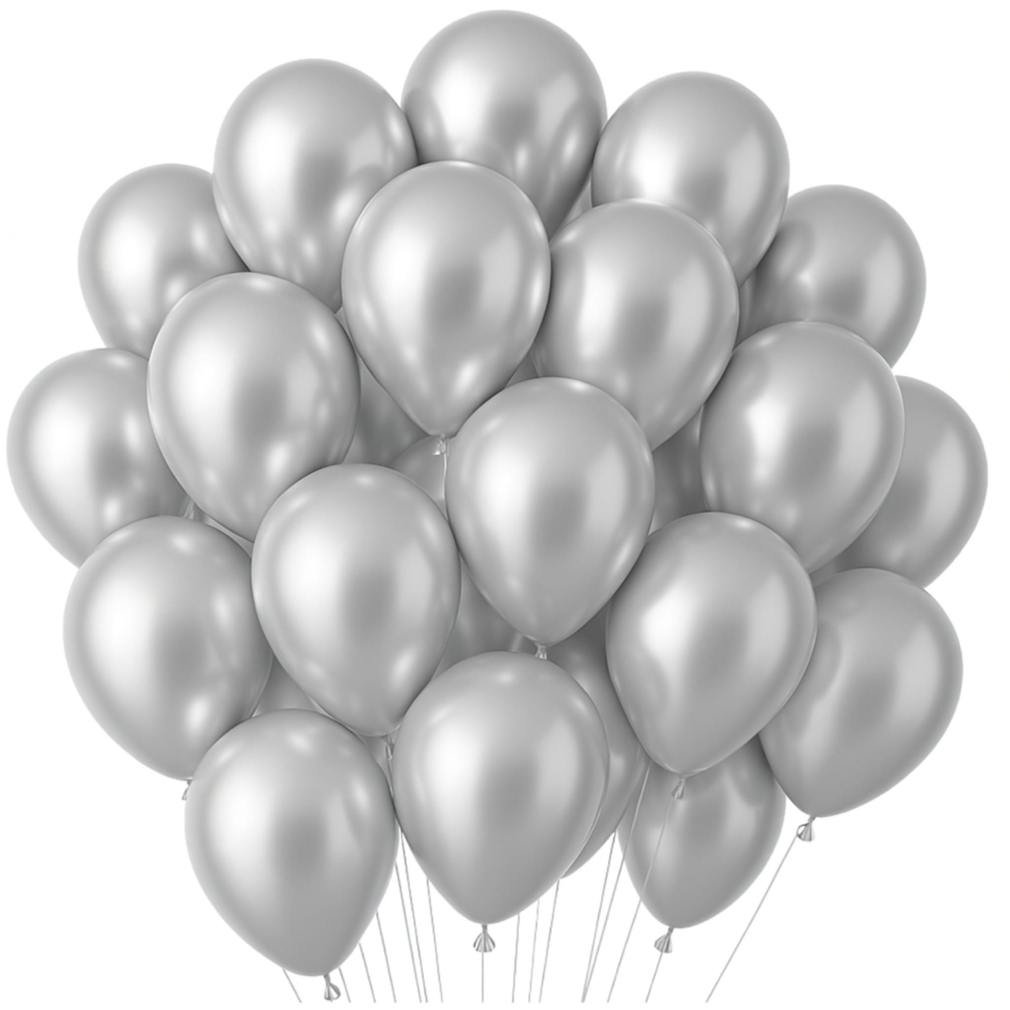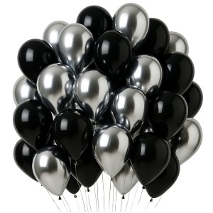 Zestaw 100 balonów lateksowych 30 cm w kolorach czarnym i srebrnym. W komplecie: 50 czarnych balonów matowych oraz 50 srebrnych balonów chromowanych. Do napełniania powietrzem lub helem.