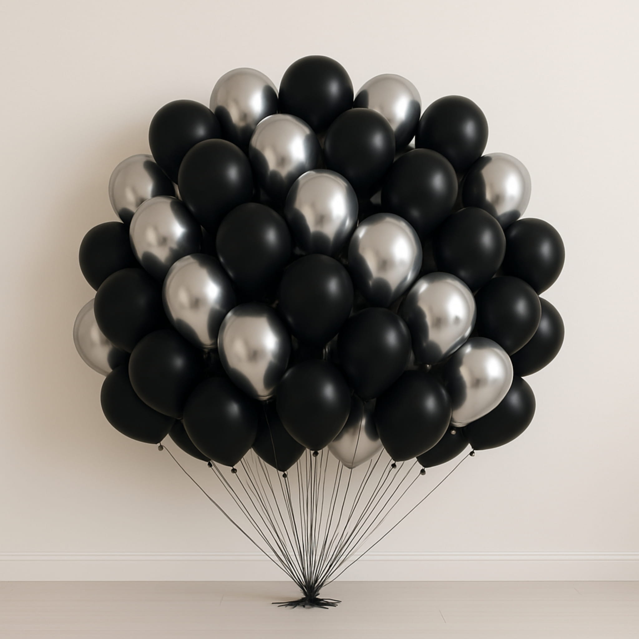 Odpowiedź: 100 balonów lateksowych 30 cm: 50 czarnych matowych oraz 50 srebrnych chromowanych.