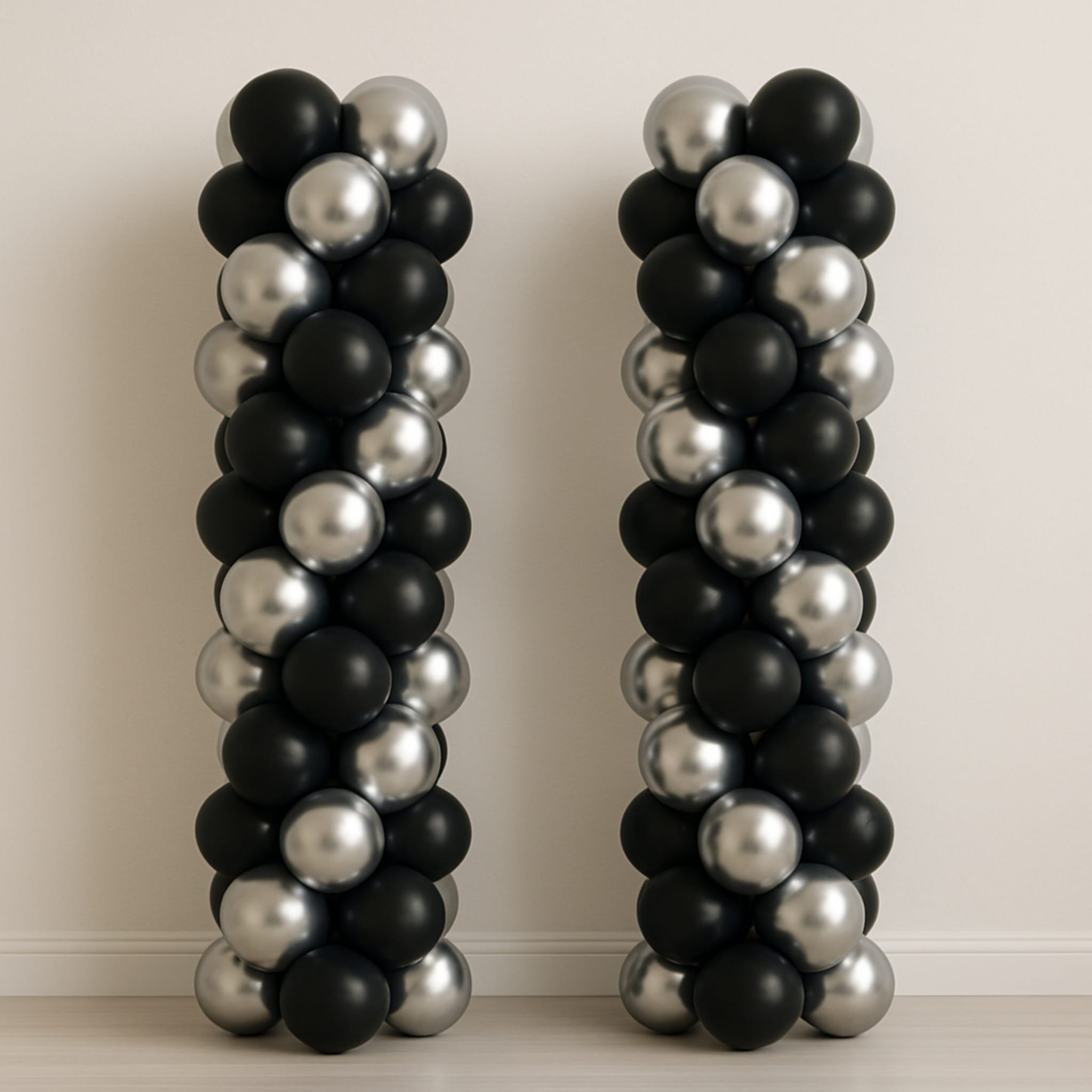 Wykorzystaj srebrne balony chromowane jako akcenty, a czarne matowe jako tło – taka proporcja dobrze wygląda w girlandzie nad stołem lub w ściance do zdjęć. Jeśli dekorujesz większą salę, rozdziel zestaw na kilka punktów: wejście, strefę tortu i miejsce do fotografii. Do spójnego efektu dobierz wstążki w czerni lub srebrze oraz jednolite dodatki na stół. Ten zestaw pasuje także do aranżacji sylwestrowych i wieczornych przyjęć.