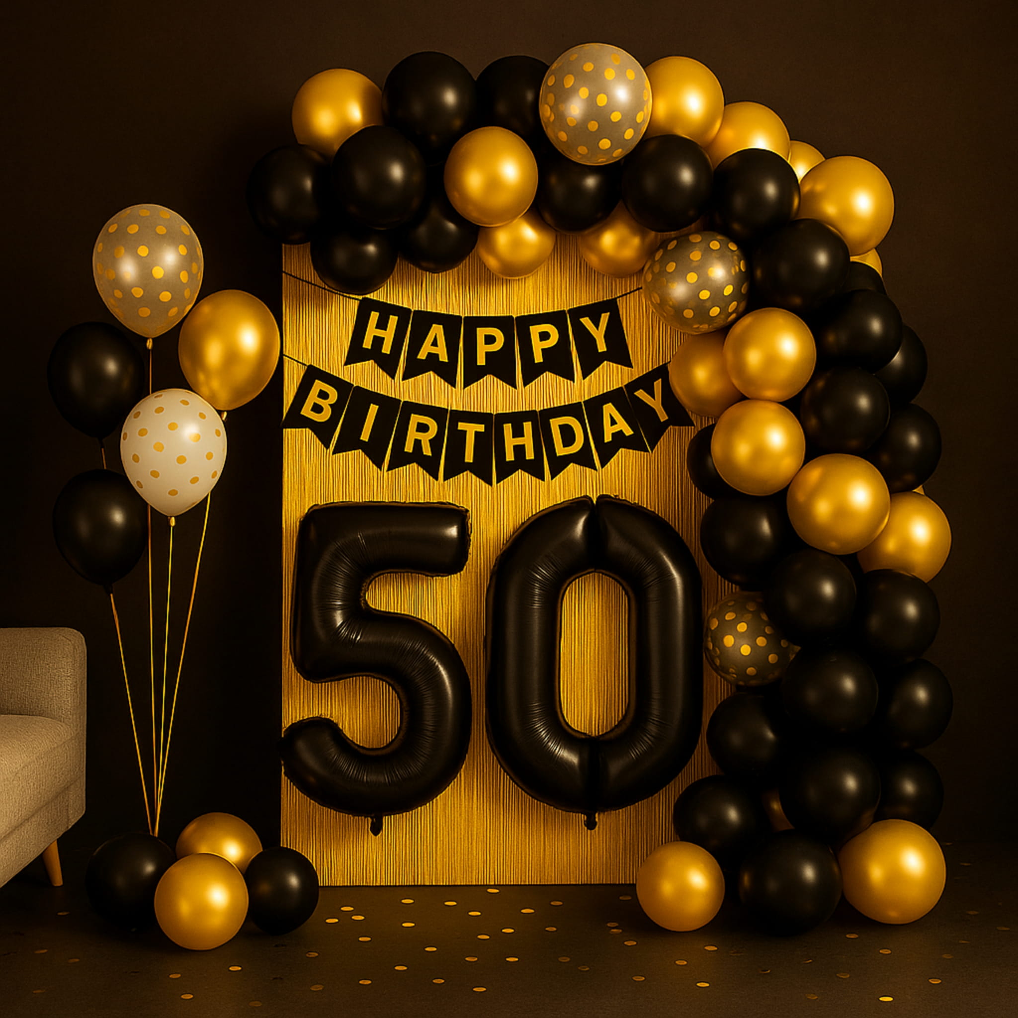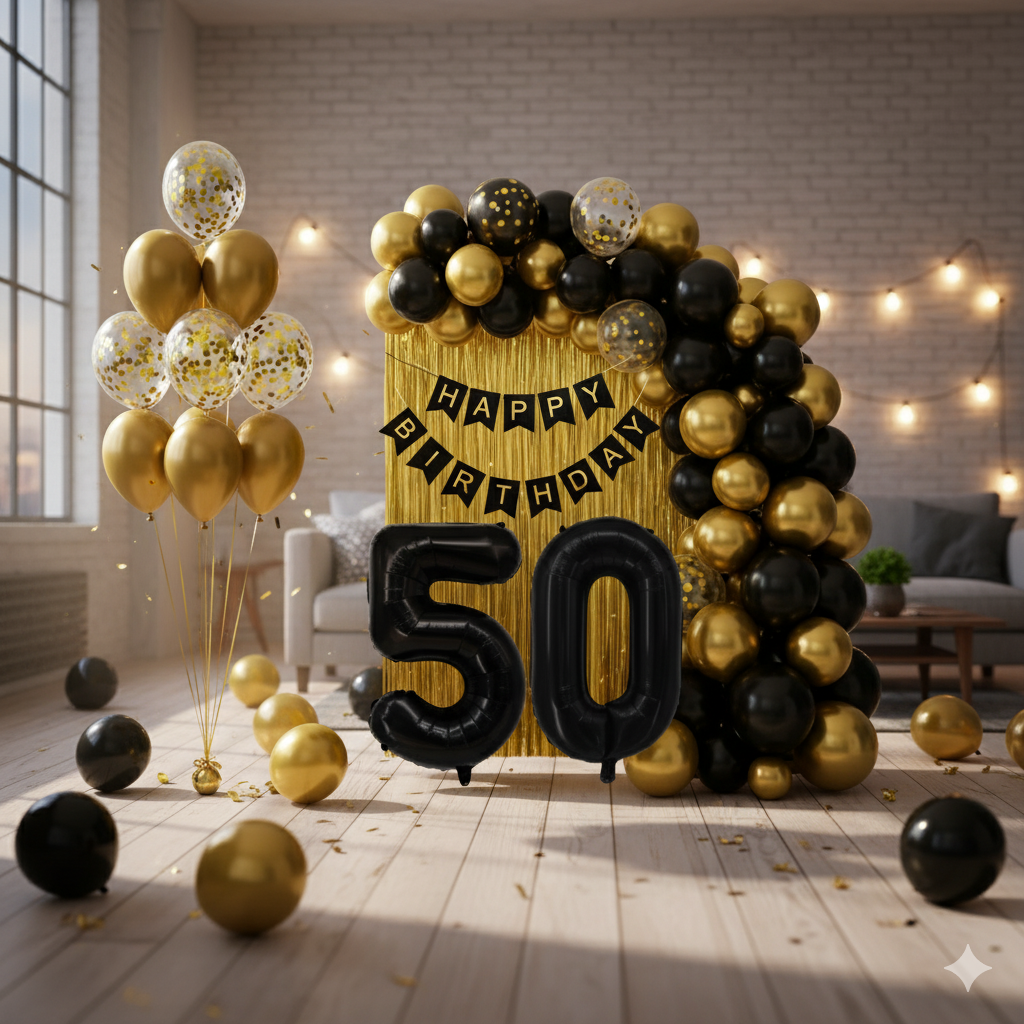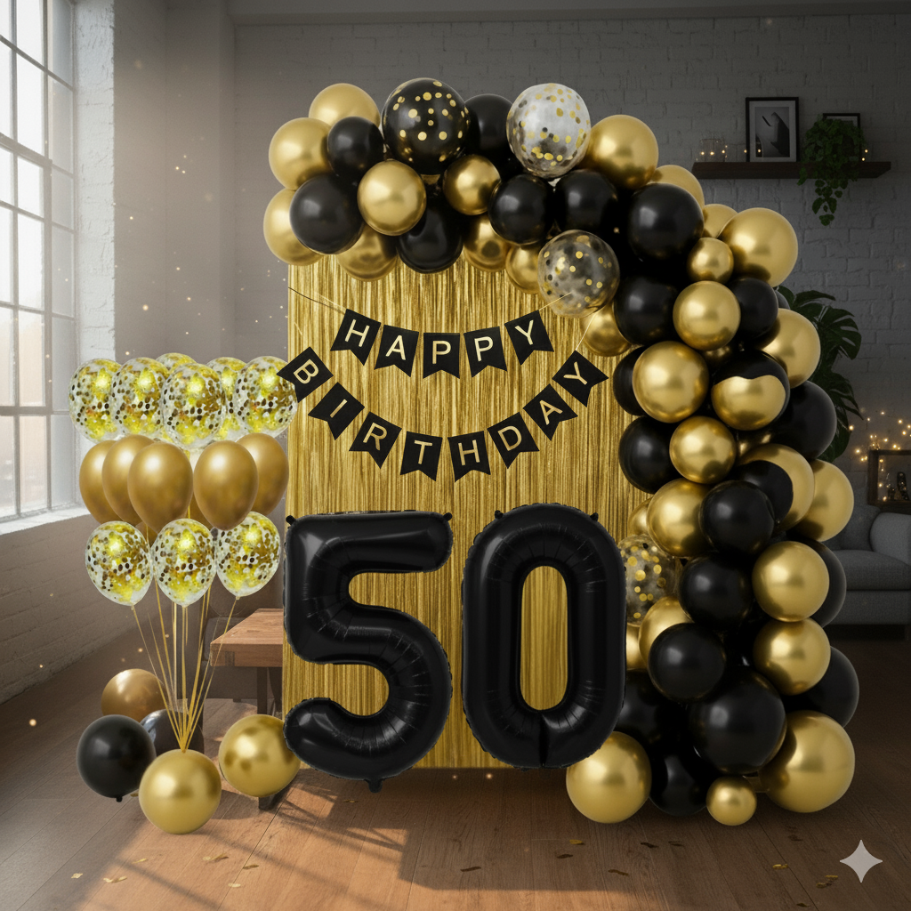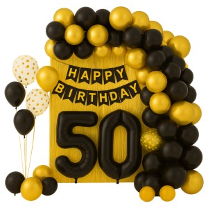 Kompletny zestaw dekoracji na 50 urodziny w czerni i złocie: girlanda balonowa, balony z konfetti, cyfry foliowe „5” i „0”, złota kurtyna oraz banner „HAPPY BIRTHDAY”. W zestawie 132 szt., do napełniania powietrzem lub helem.