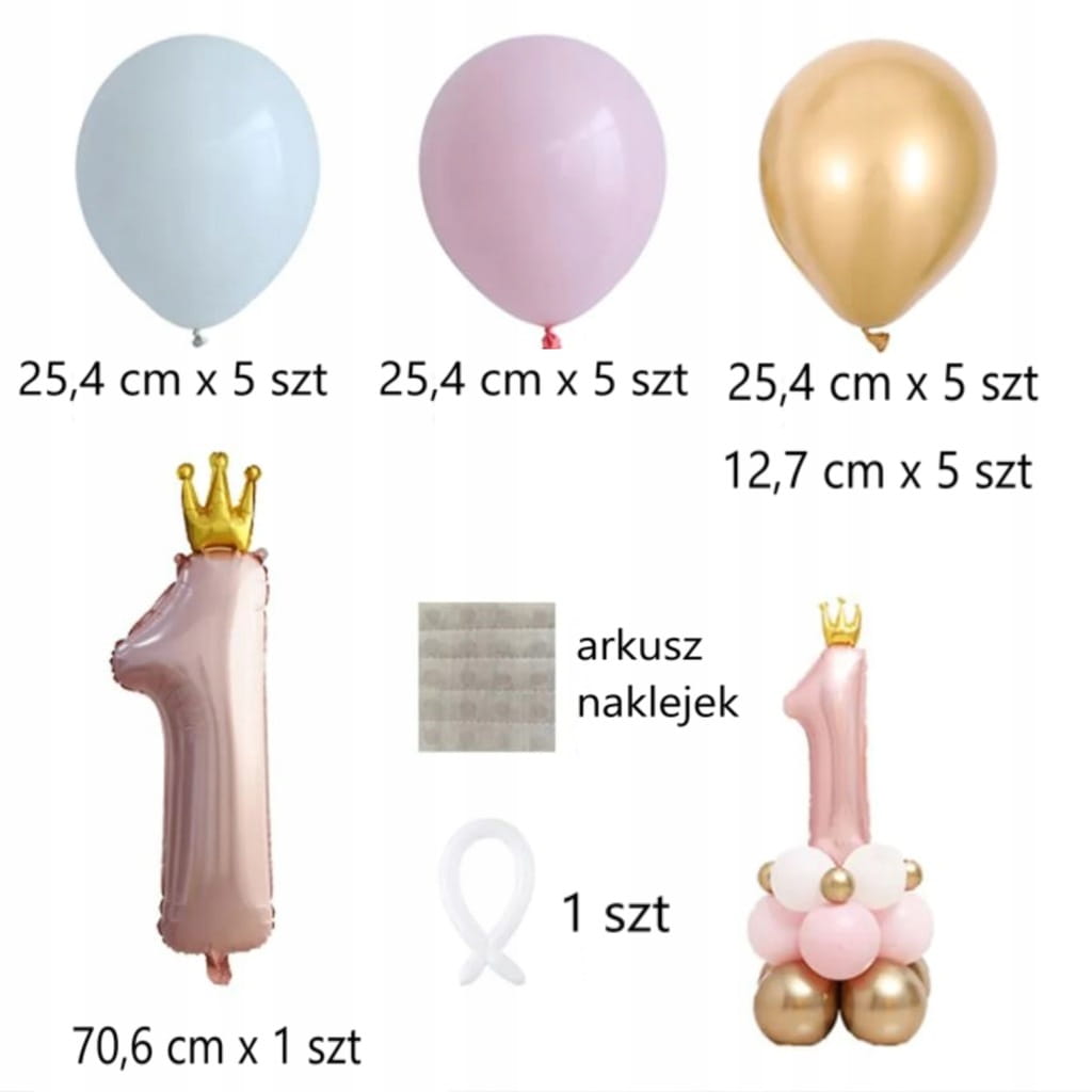 Odpowiedź: Zestaw zawiera 23 elementy: 5x balon biały 25,4 cm, 5x balon różowy 25,4 cm, 5x balon złoty 25,4 cm, 5x balon złoty 12,7 cm, 1x balon cyfra z koroną 70,6 cm, 1x balon długi biały oraz kropki kleju do łączenia balonów.