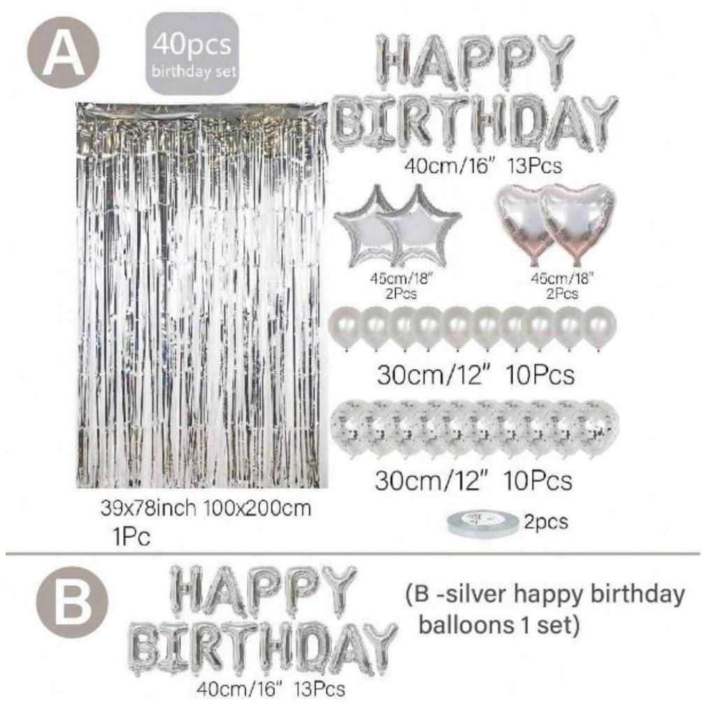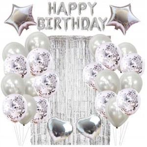 Odpowiedź: Napis foliowy “Happy Birthday” (ok. 40 cm), 2 balony foliowe serce (ok. 46 cm), 2 balony foliowe gwiazda (ok. 46 cm), srebrna kurtyna dekoracyjna (ok. 2 m), 10 balonów chromowanych srebrnych (ok. 31 cm), 10 balonów lateksowych z konfetti srebrnym (ok. 31 cm), srebrna taśma do wiązania balonów oraz taśma dwustronna do mocowania dekoracji.