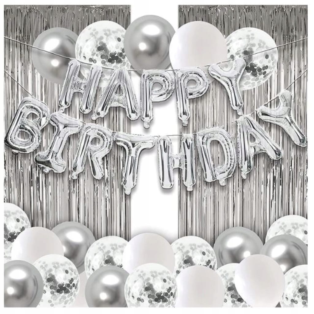 Srebrny zestaw dekoracji urodzinowej z napisem foliowym “Happy Birthday”, balonami chromowanymi i z konfetti oraz kurtyną 2 m. W komplecie także serca i gwiazdy foliowe oraz taśmy do wiązania i montażu. Do napełnienia powietrzem lub helem.