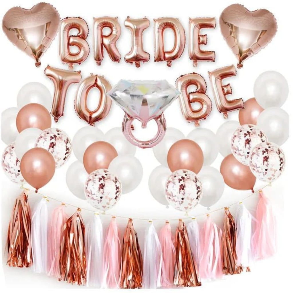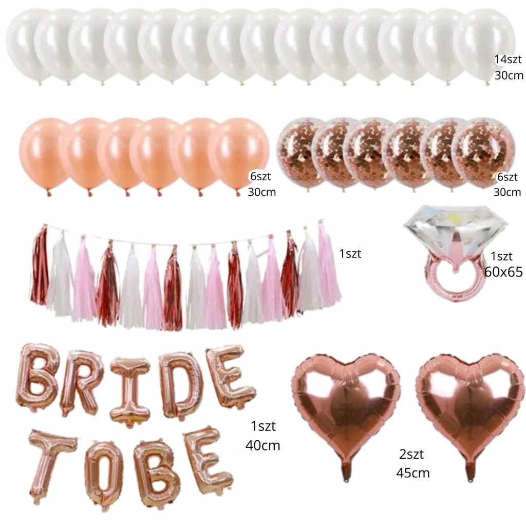 Odpowiedź: 14 białych balonów 30 cm, 6 brzoskwiniowych balonów 30 cm, 6 balonów konfetti 30 cm, taśmę z frędzlami, balon pierścionek 60 × 65 cm, napis BRIDE TO BE oraz 2 balony foliowe serca.