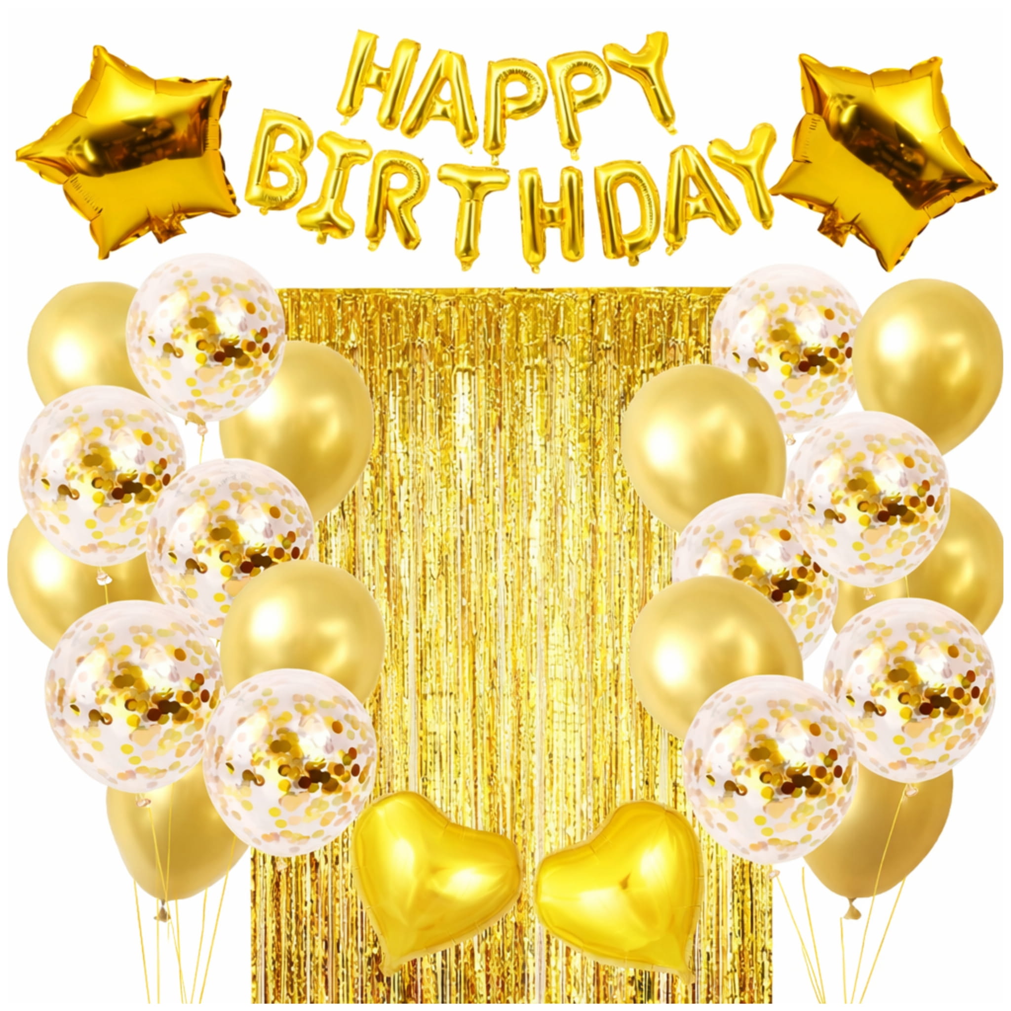 Odpowiedź: Napis „Happy Birthday” (ok. 40 cm), 2 balony foliowe serce (ok. 46 cm), 2 balony foliowe gwiazda (ok. 46 cm), kurtyna złota (ok. 2 m), 10 balonów lateksowych złotych (ok. 31 cm), 10 balonów lateksowych z konfetti złotym (ok. 31 cm) oraz złota taśma do wiązania balonów i taśma dwustronna do montażu.
