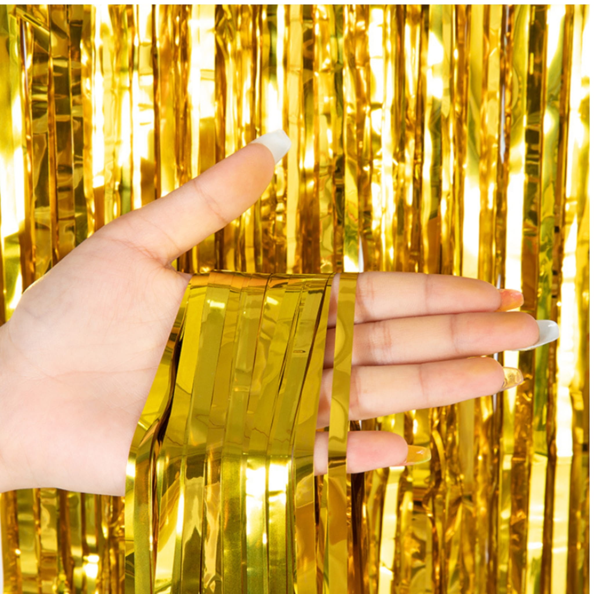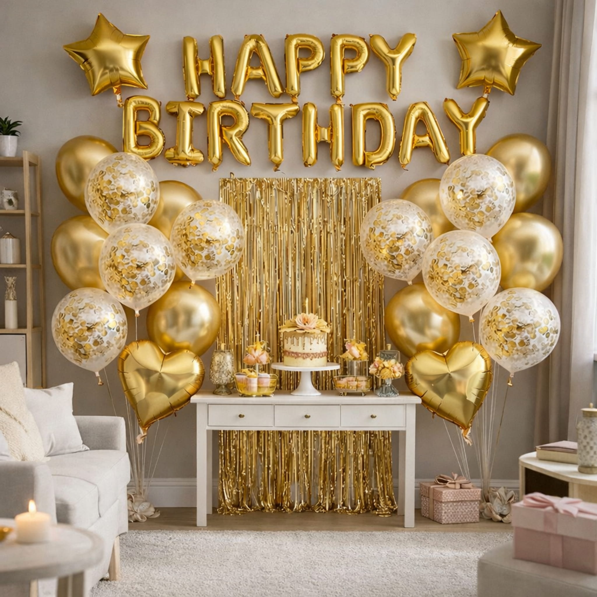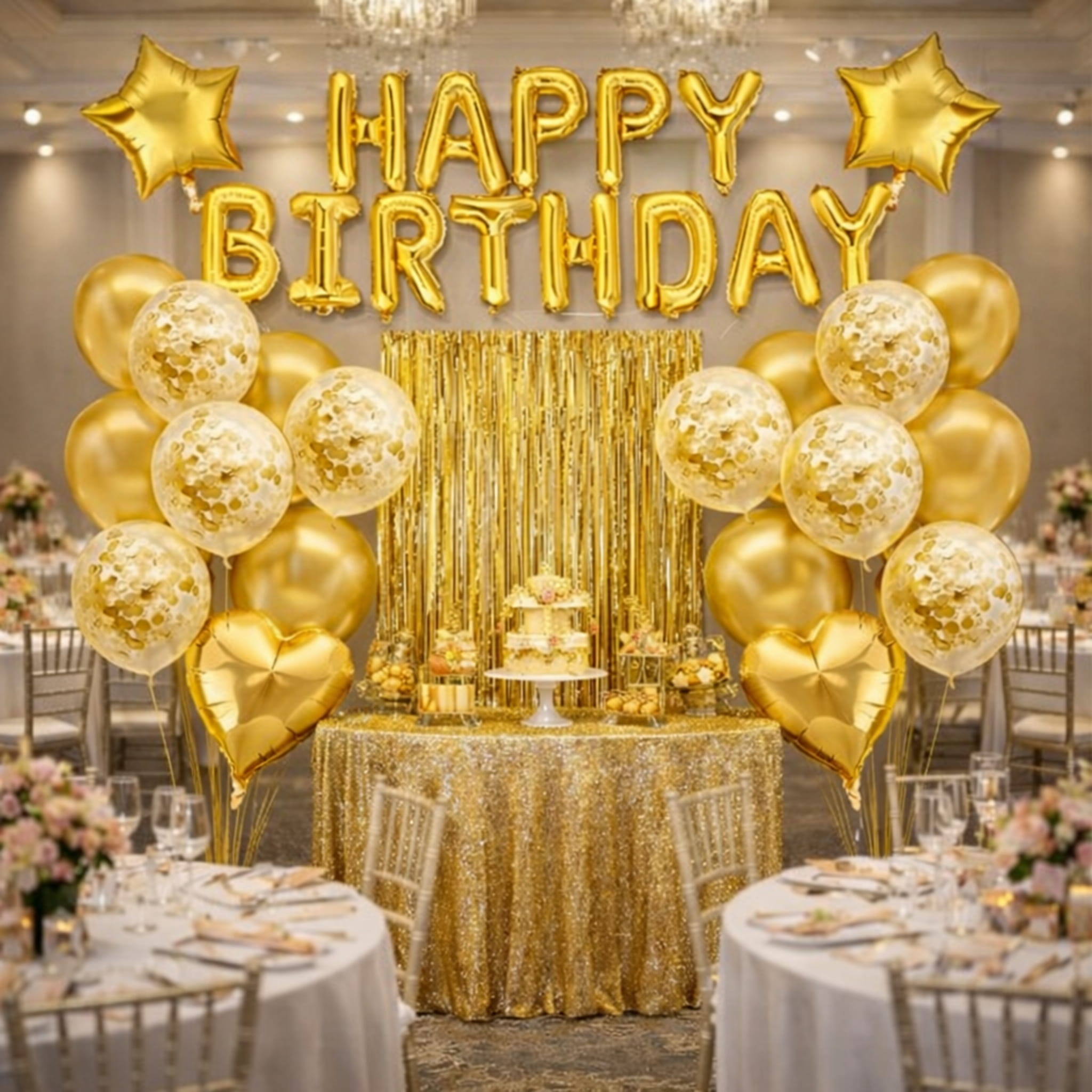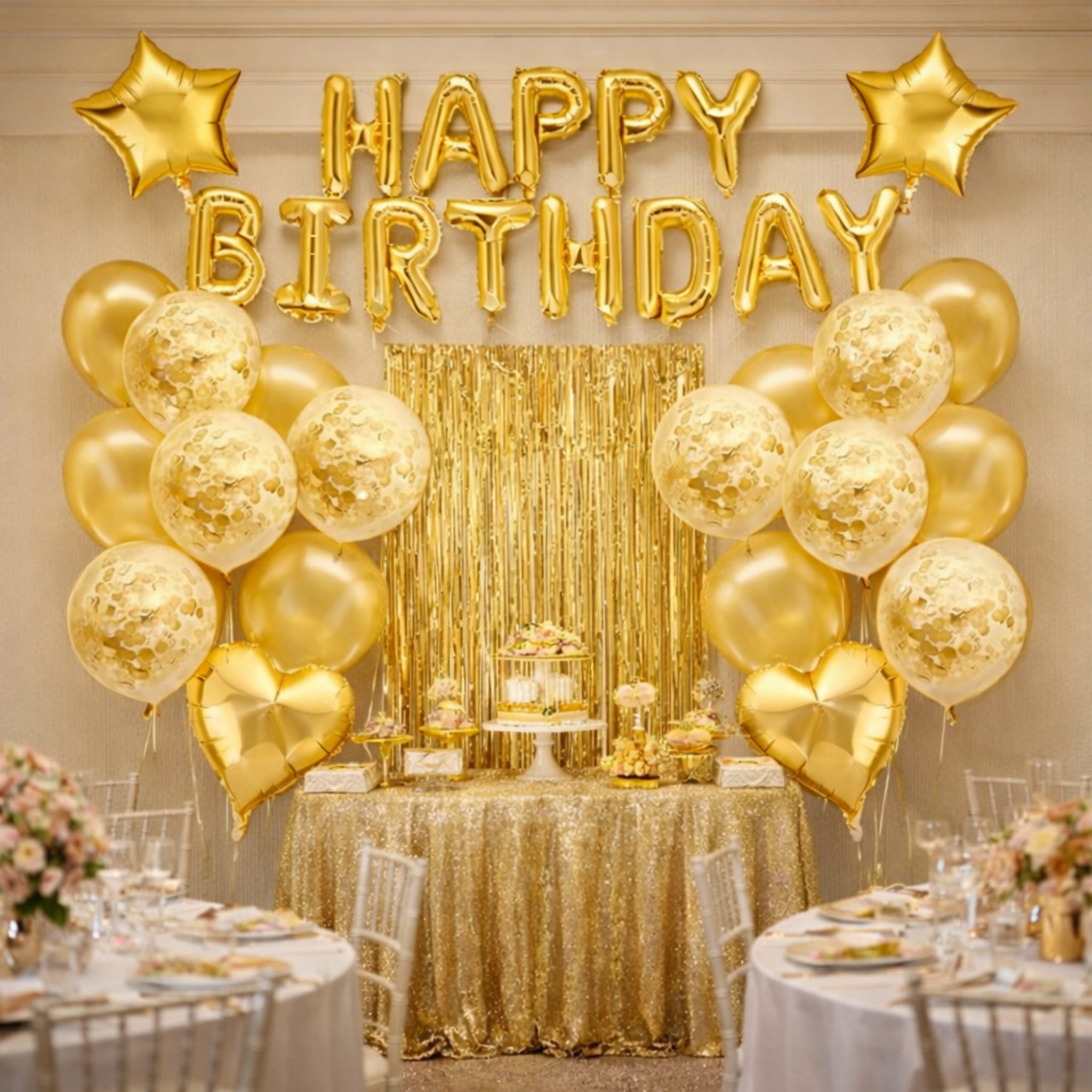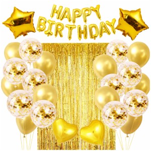 Zestaw 40 elementów do stworzenia złotego tła do zdjęć na urodziny: kurtyna, balony lateksowe złote i z konfetti oraz balony foliowe (napis, serca i gwiazdy). Balony można napełniać powietrzem lub helem. W komplecie są też akcesoria do montażu dekoracji.