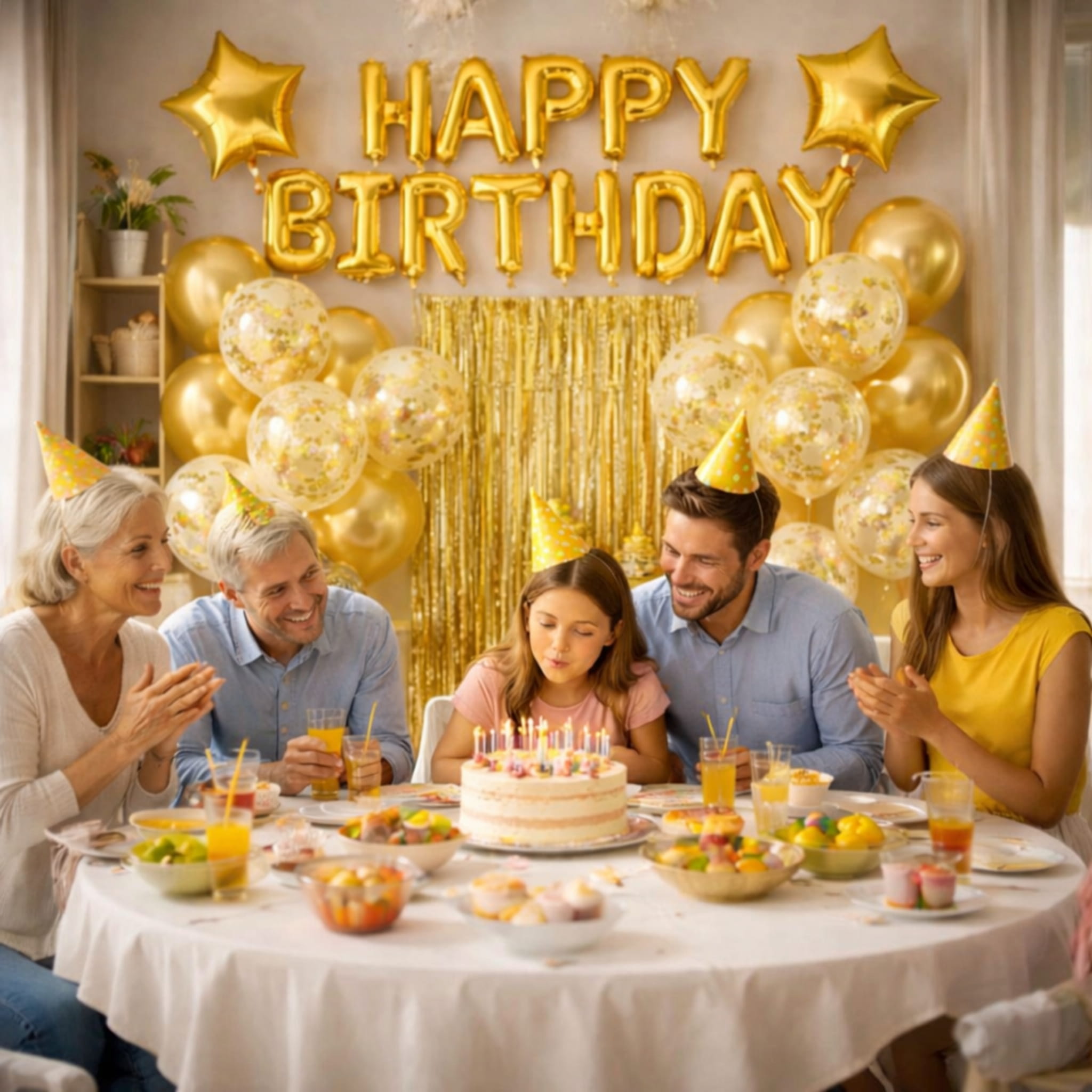 Zawieś złotą kurtynę na ścianie jako tło, a następnie ułóż przed nią balony warstwowo, mieszając złote i konfetti. Foliowe serca i gwiazdy rozmieść po bokach, żeby domknąć kompozycję, a napis „Happy Birthday” ustaw w centralnym punkcie. Balony z konfetti po napompowaniu delikatnie potrzyj suchą ściereczką, aby konfetti lepiej przylgnęło do ścianek. Jeśli chcesz rozbudować aranżację, dodaj balony cyfry jako akcent jubileuszowy i dobierz pasujące dodatki w kategorii balony.