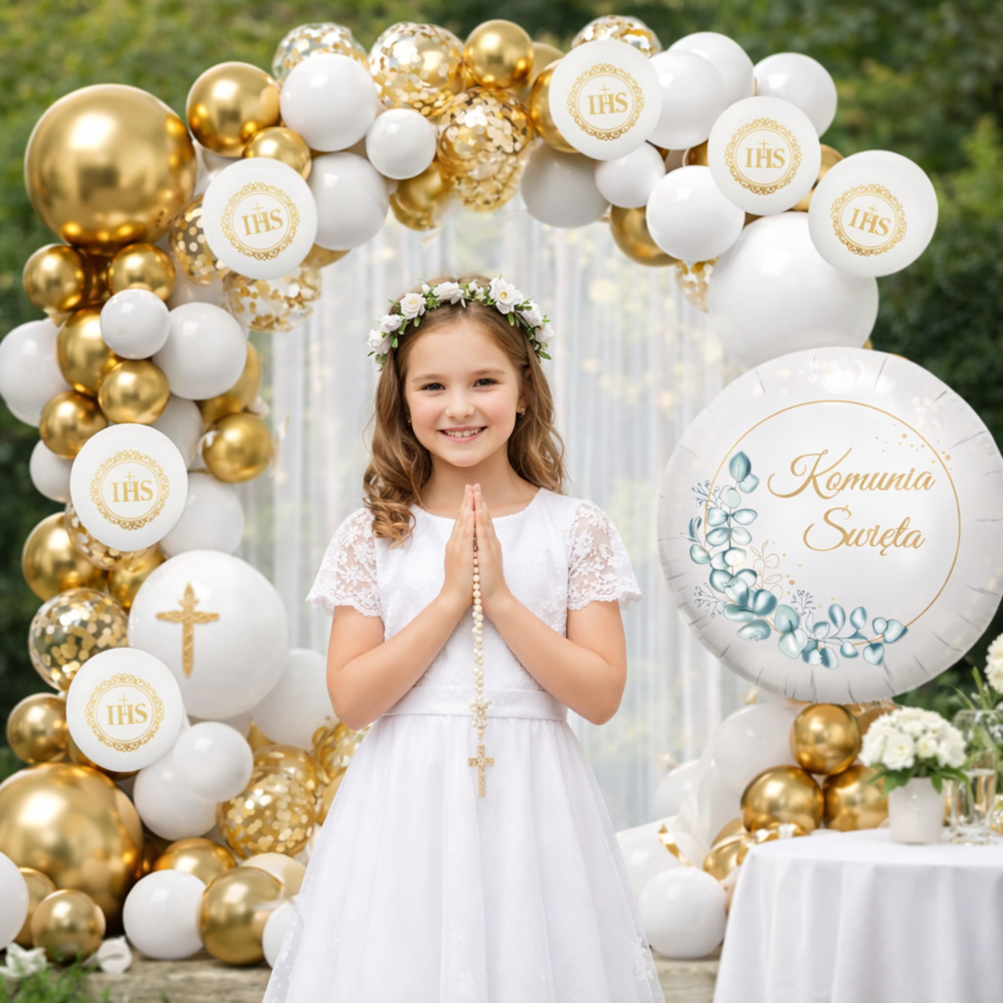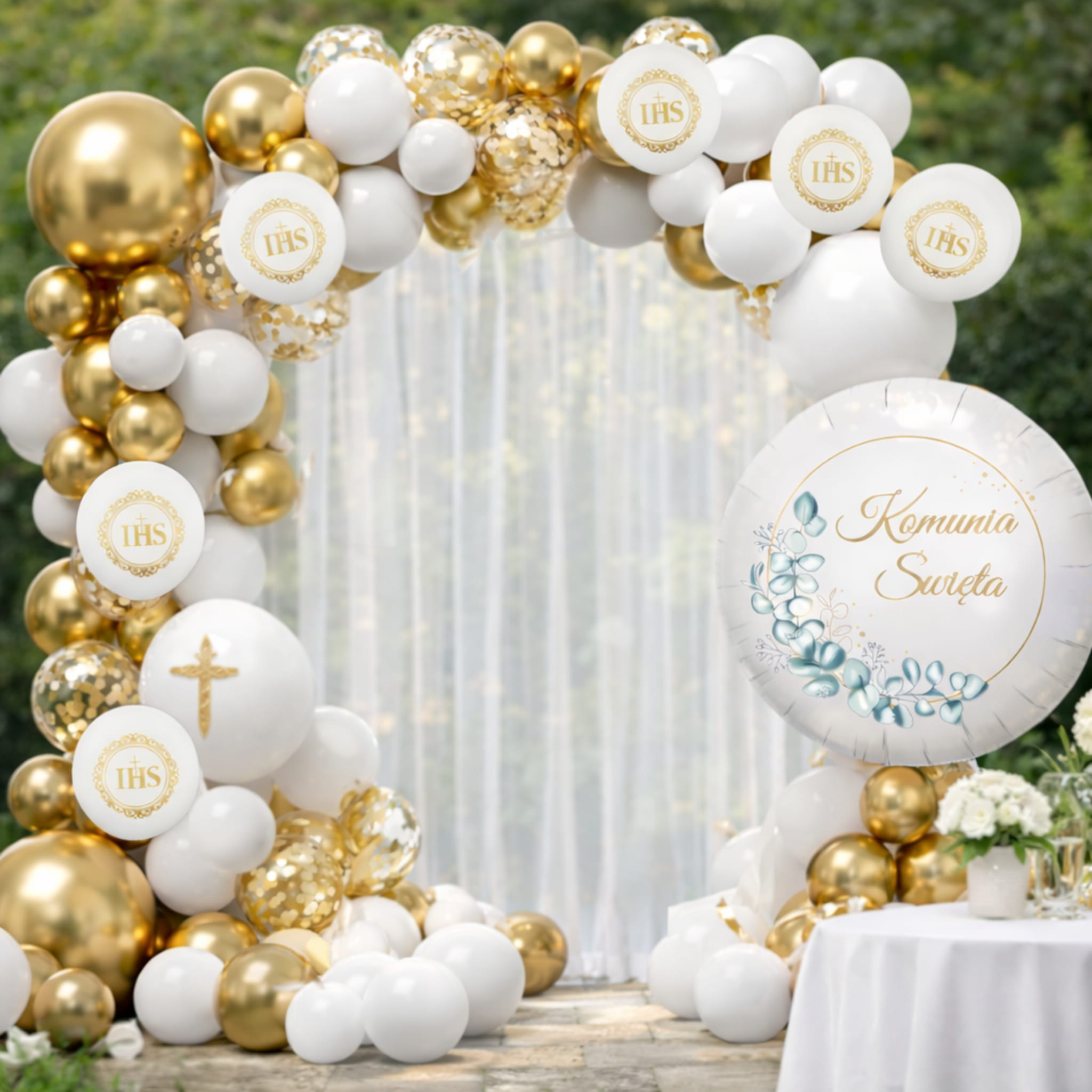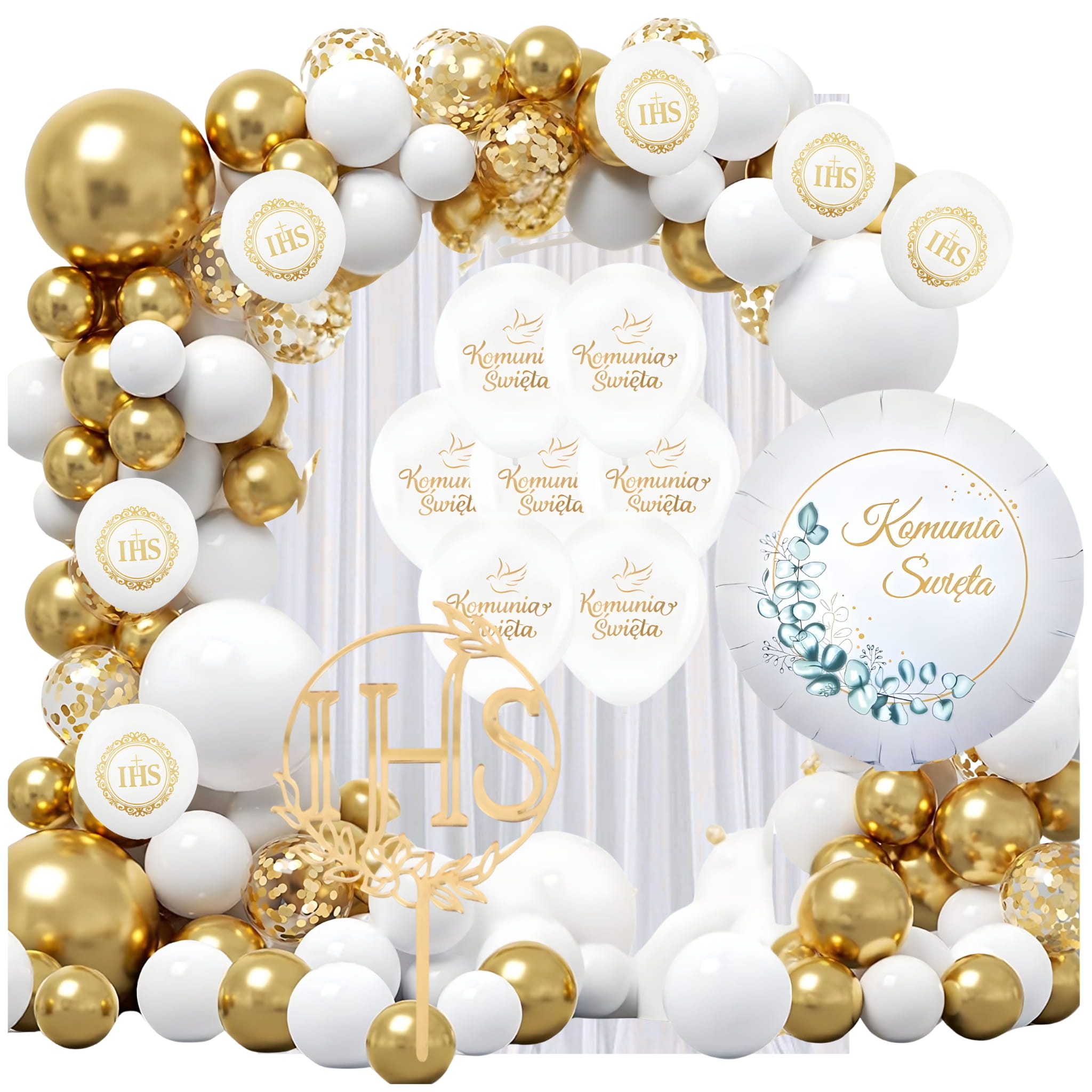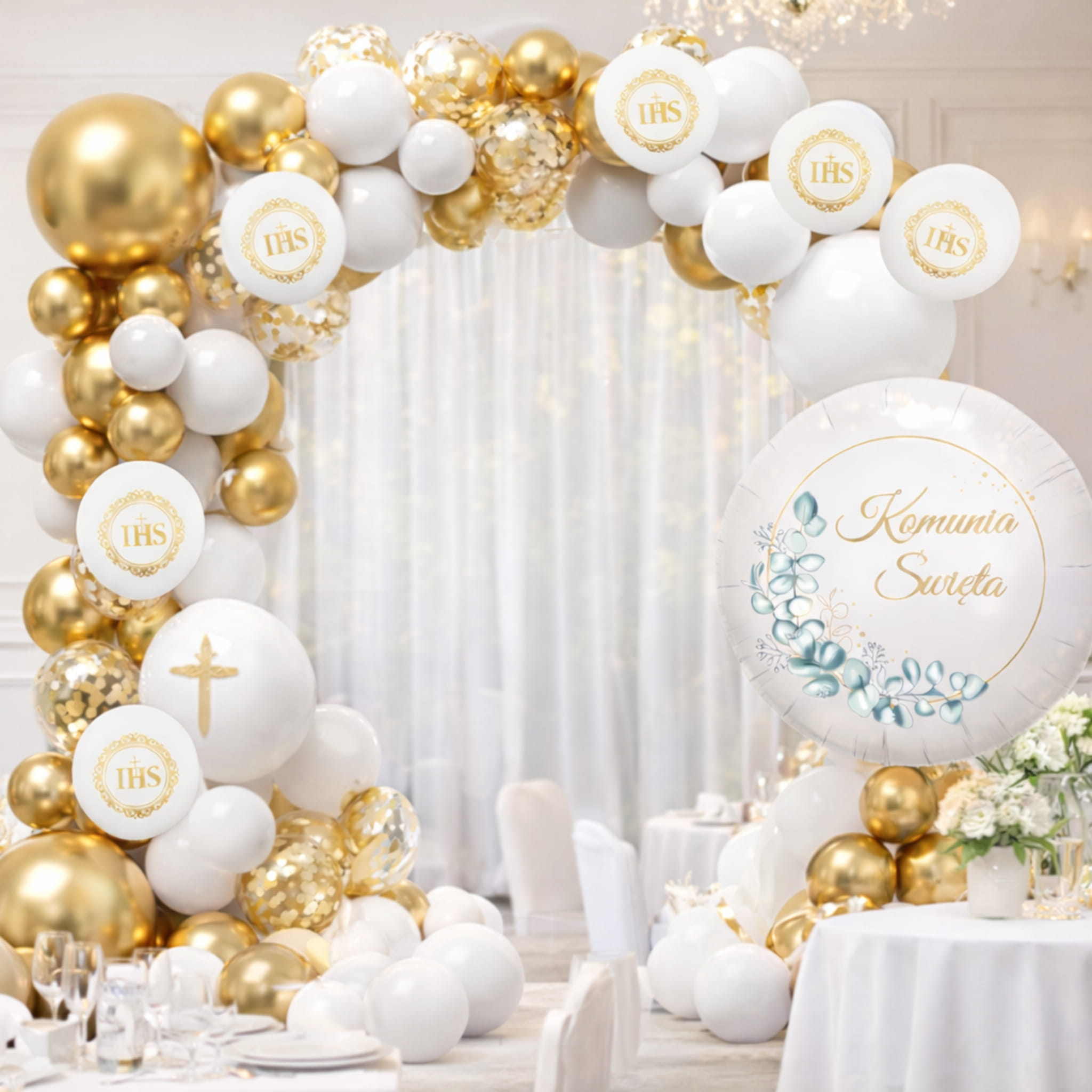 Elegancki zestaw dekoracji na Pierwszą Komunię Świętą w kolorystyce biało-złotej z elementami konfetti. W komplecie girlanda balonowa (135 elementów) oraz dodatki: balony z napisami, kurtyna dekoracyjna i złoty topper IHS.