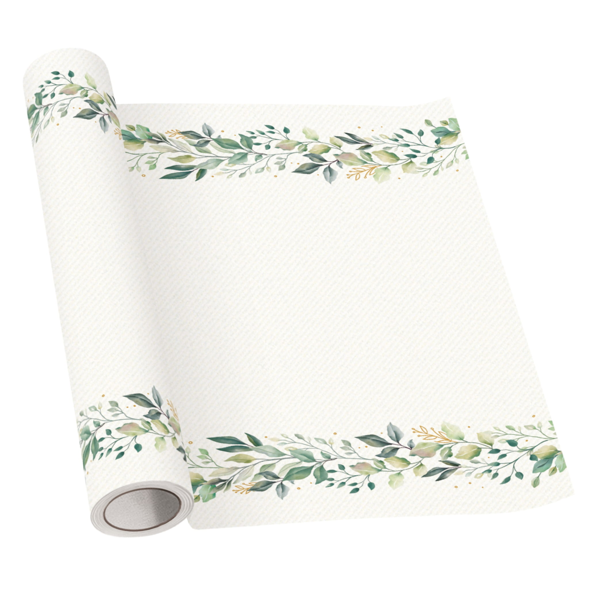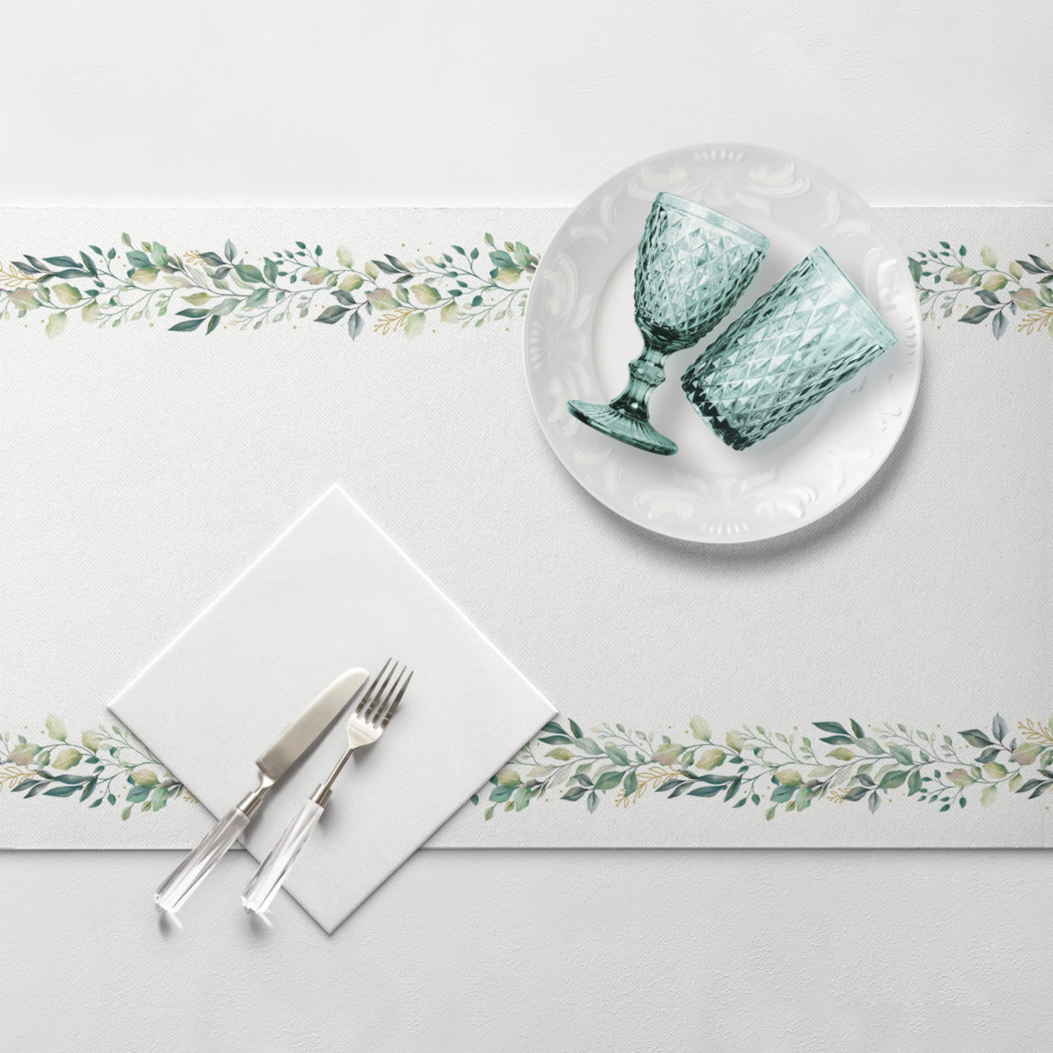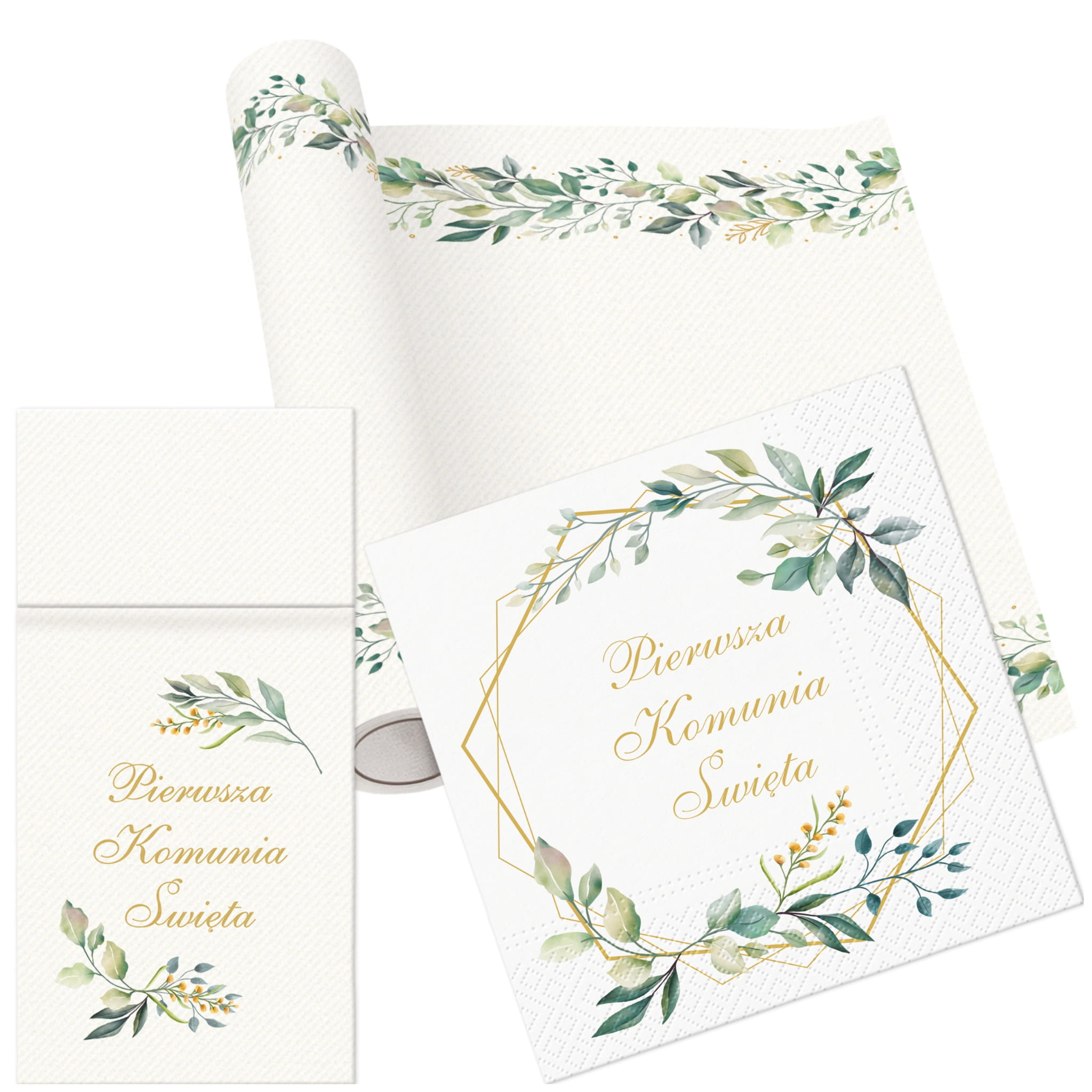Gotowy zestaw dekoracji stołu na Pierwszą Komunię Świętą w biało-zielonej stylistyce eukaliptusa. W komplecie bieżnik 40 cm x 5 m, 20 serwetek 33 x 33 cm oraz 25 etui na sztućce.