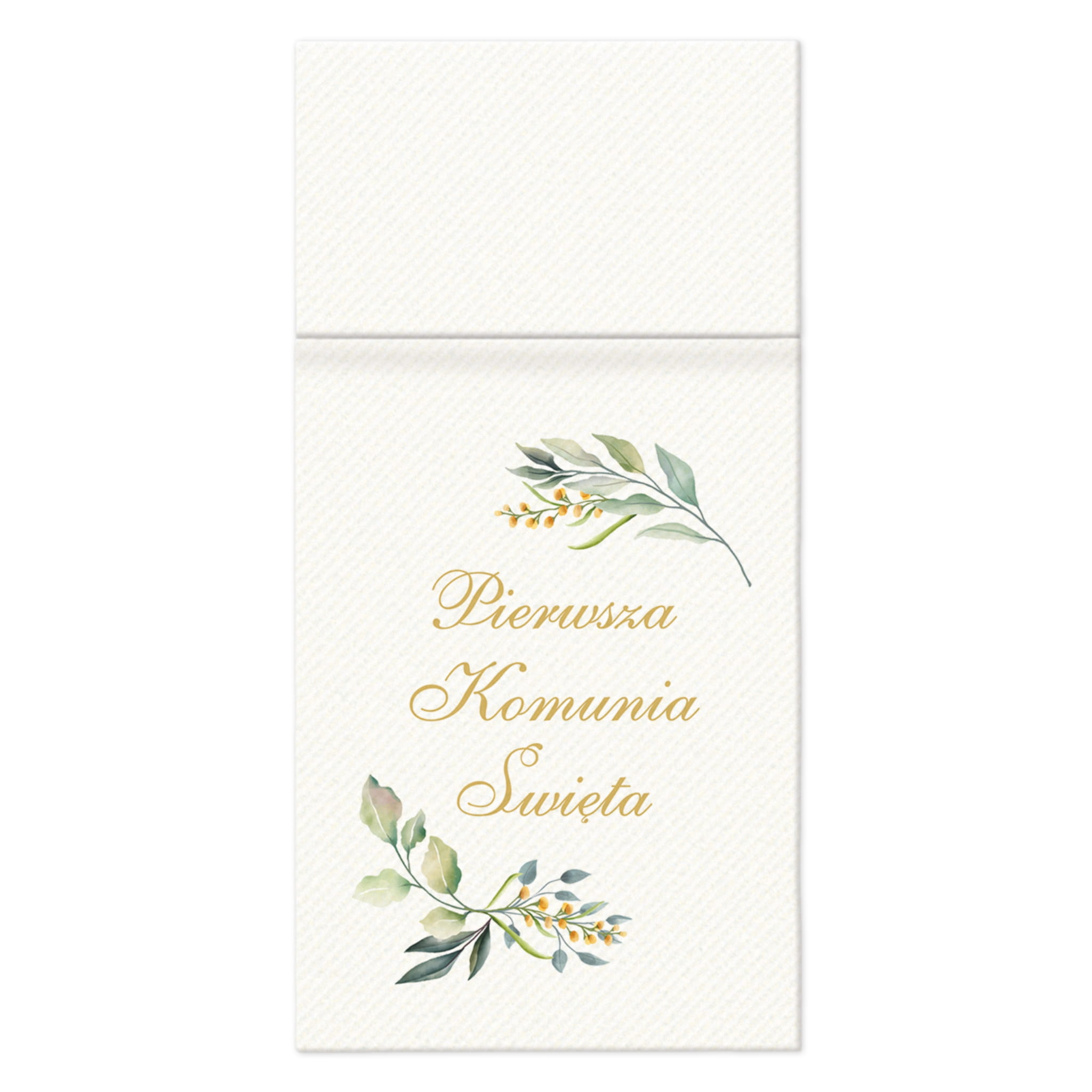 - Czytelny nadruk okolicznościowy – „Pierwsza Komunia Święta” na serwetkach i etui.
