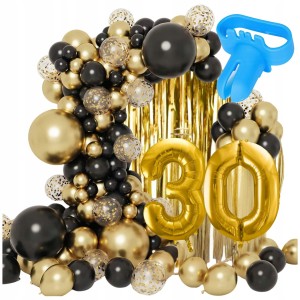 Zestaw 110 elementów do wykonania girlandy balonowej w kolorach czarnym i złotym. W komplecie są balony w kilku rozmiarach, taśma do łączenia balonów (5 m), kropki klejowe oraz złota kurtyna 2 m x 1 m i 2 balony cyfry 81 cm.